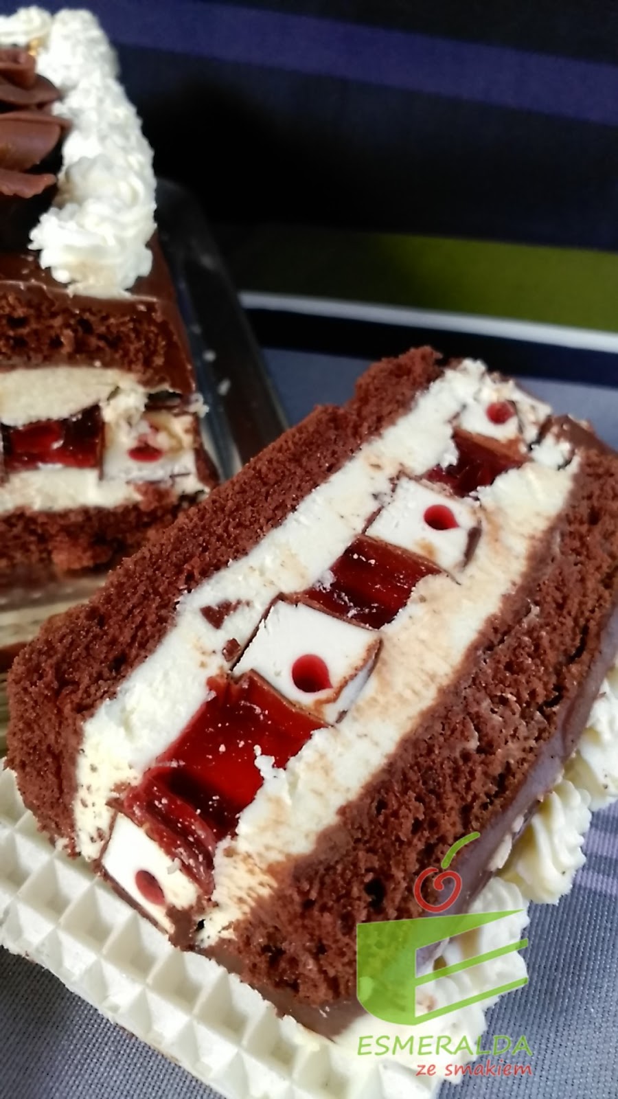 Tort jest fantastyczny! W środku czekoladowy, przełożony kremem waniliowo-budyniowym, ptasim mleczkiem i orzeźwiającą galaretką. Zaskakuje w przekroju i smakuje wybornie.